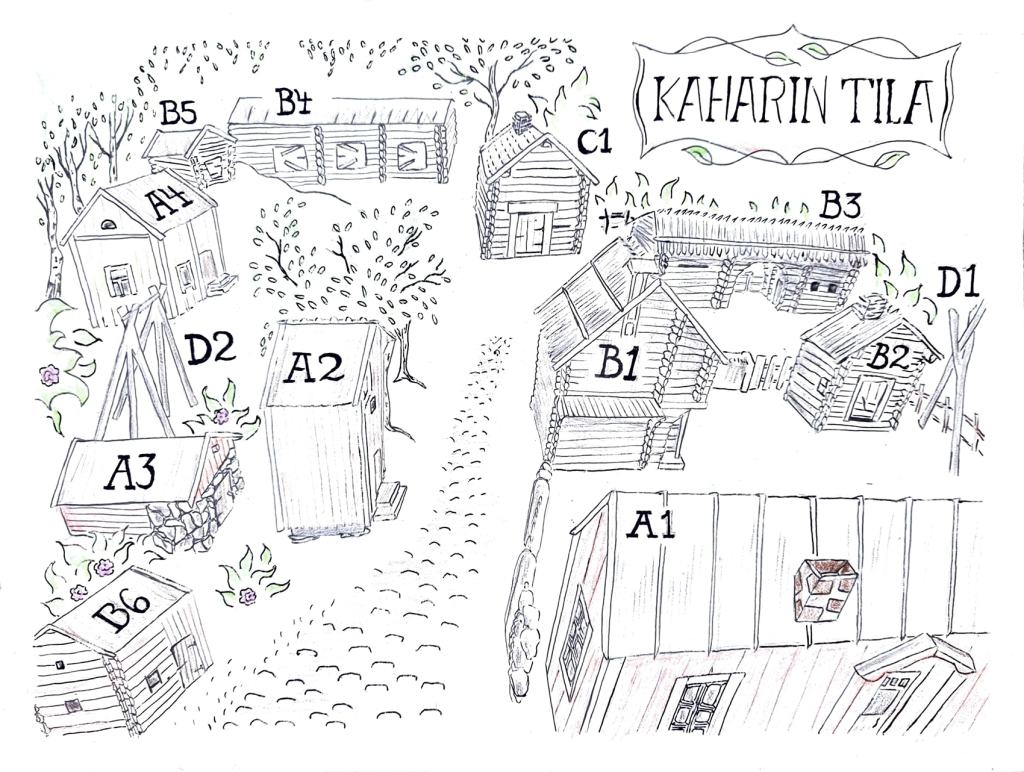Kaharin päärakennuksessa toimi kestikievari n. vuoteen 1908 saakka. Siirtolaisia ennen talossa asui sairaanhoitaja Gustavsson, joka muutti siihen n. 1919. Häntä ennen talossa oli asunut metsänhoitaja Koski. Kapinan aikana talossa toimi punaisten ensiapuasema.